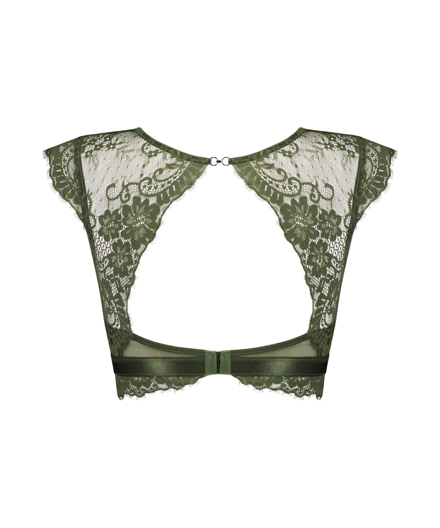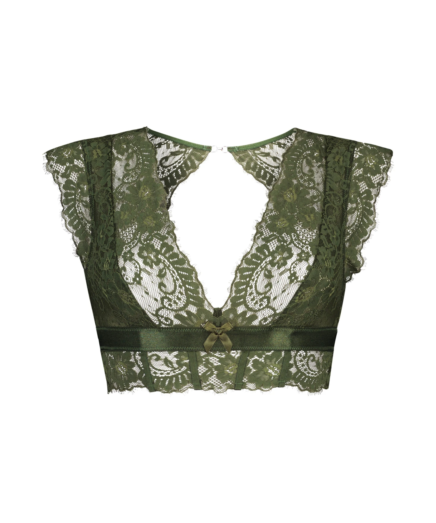 Feel sexy in this bralette top! The bralette is made of lace, has cap sleeves, a sexy open back and a closure clip on the back of the collar. The top is also perfect to wear on a night out!