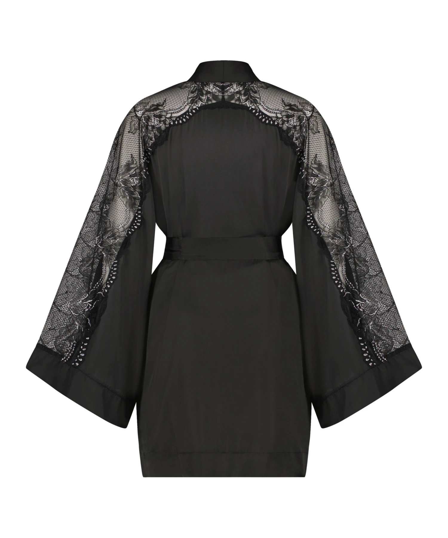 This chic kimono highlights a classic silhouette complete with a glamorous silver lurex finish on the lace sleeves. Featuring a delicate tie sash that allows for subtle fit adjustments, the elegant kimono is made of a sleek, luxurious satin with a semi-sheer finish for a discreetly seductive look. Combine with the Donna slip dress to complete the look! This piece is part of a silver lurex collection that can be mixed and matched to create endless possibilities.