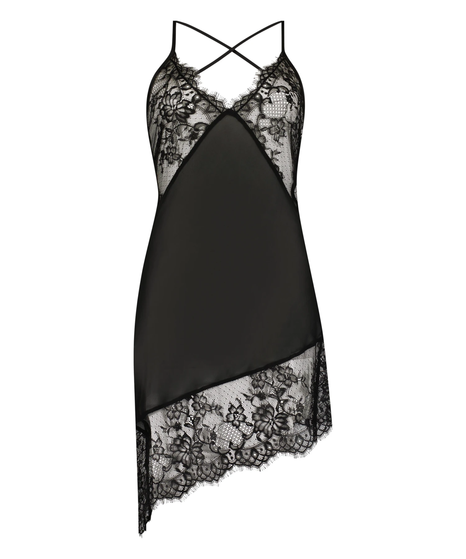 This slip dress is super sexy with its semi-see-through fabric! It has gorgeous lace edging and crossing straps on the back. Part of the Private Collection.