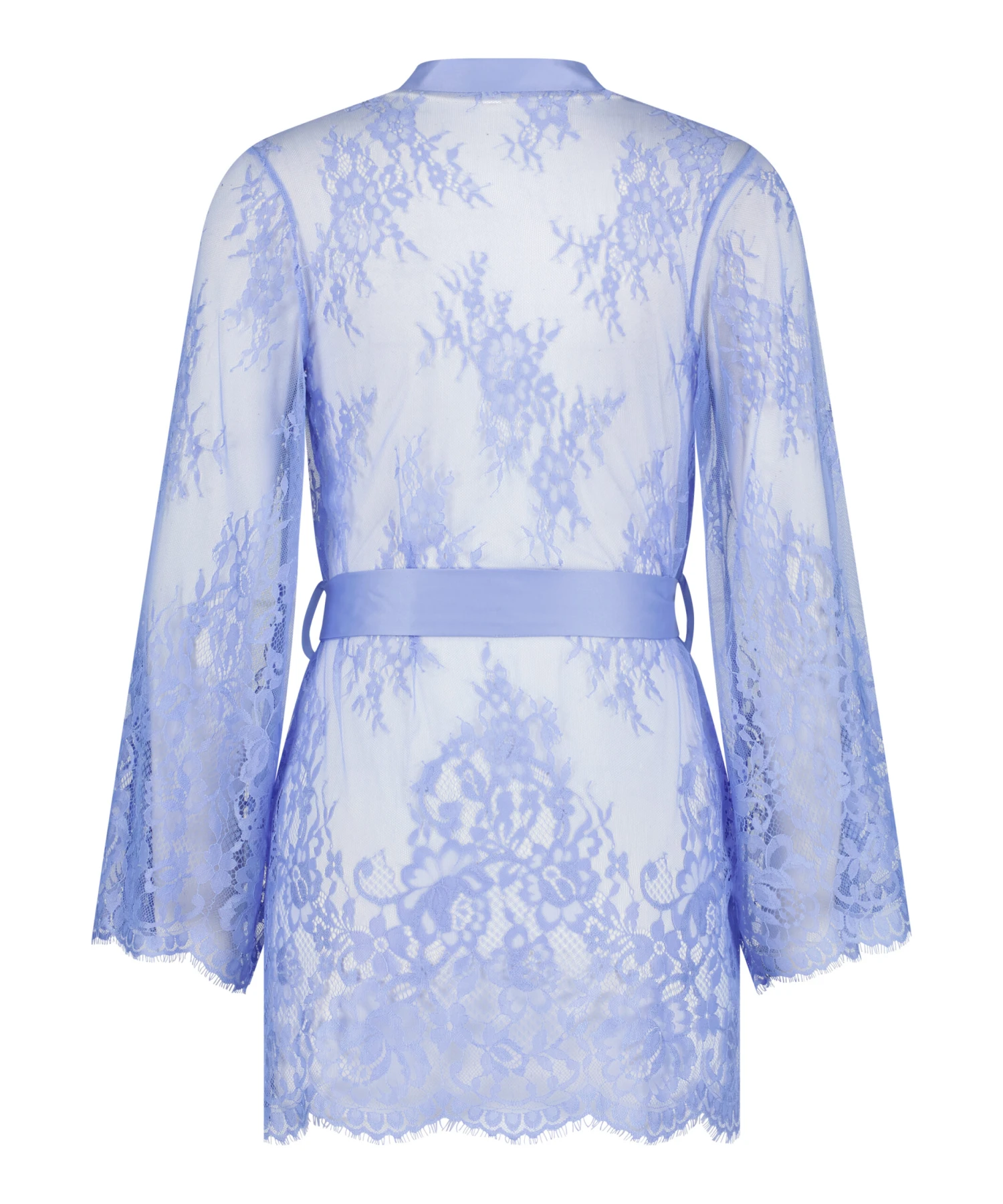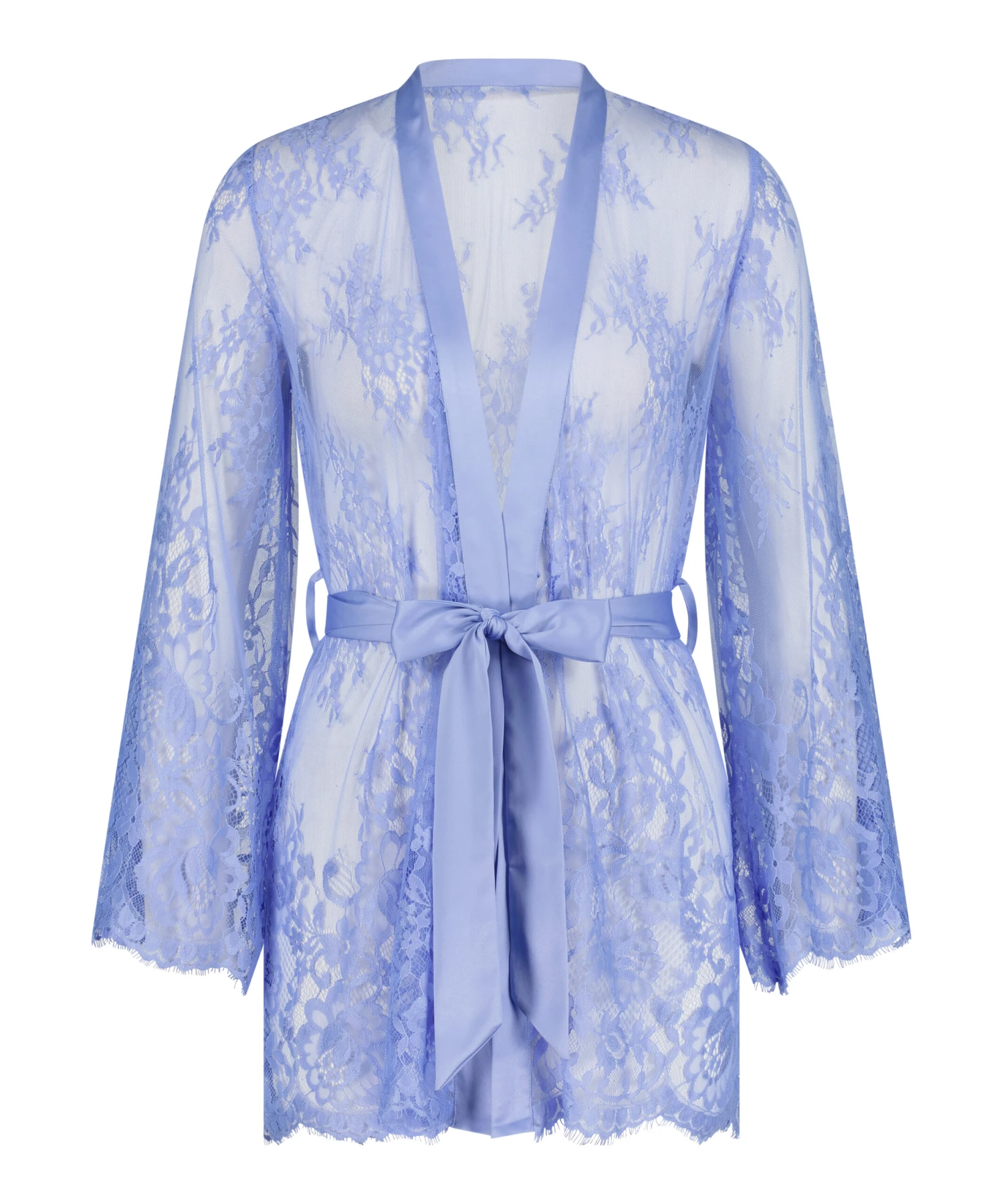 This kimono has it all: sexy, feminine and lots of lace. It is made from transparent lace with satin details and has a button-up front.