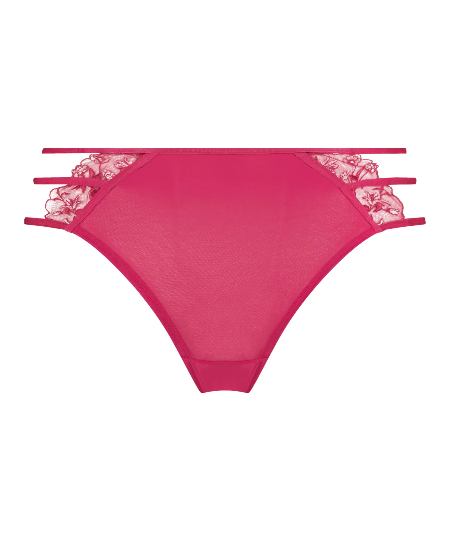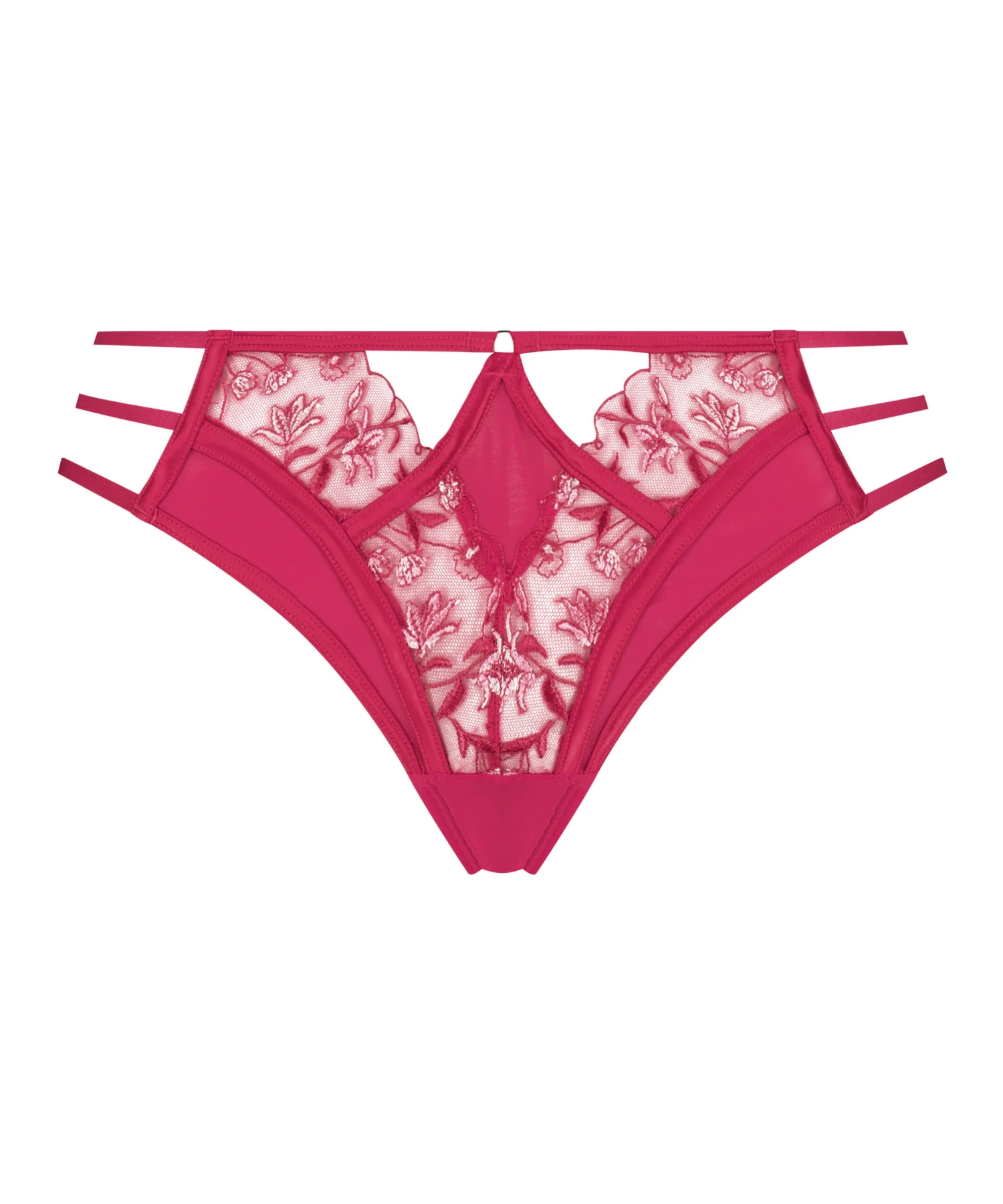 This brazilian is super unique! With lots of cut-out and strappy details to create a sexy look. It has an all-over semi transparent look due to the subtle mesh details. Combine with the matching bralette to complete the look!