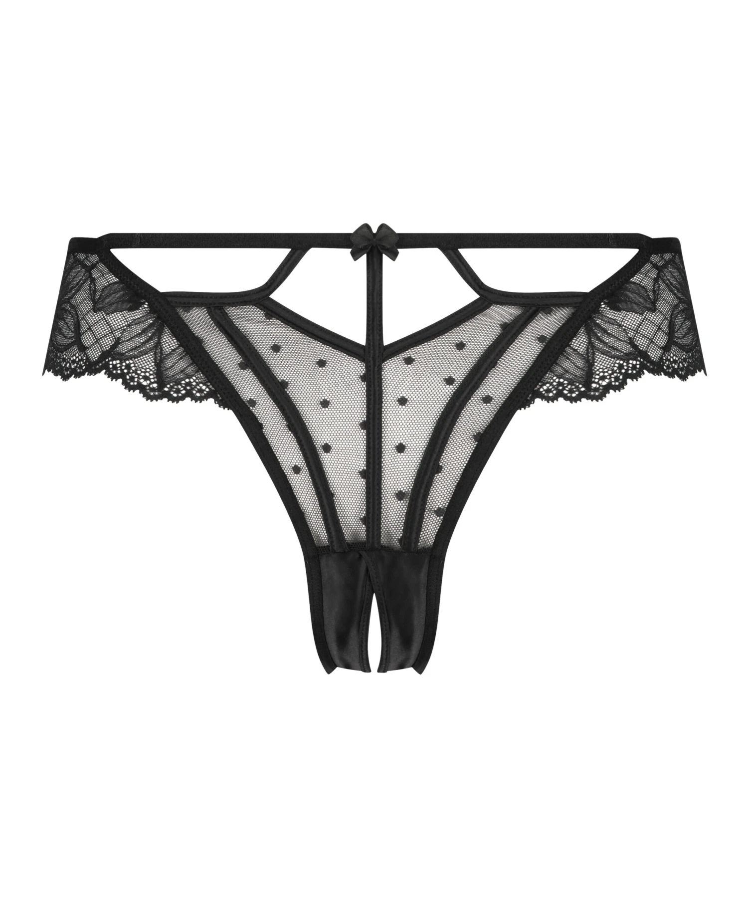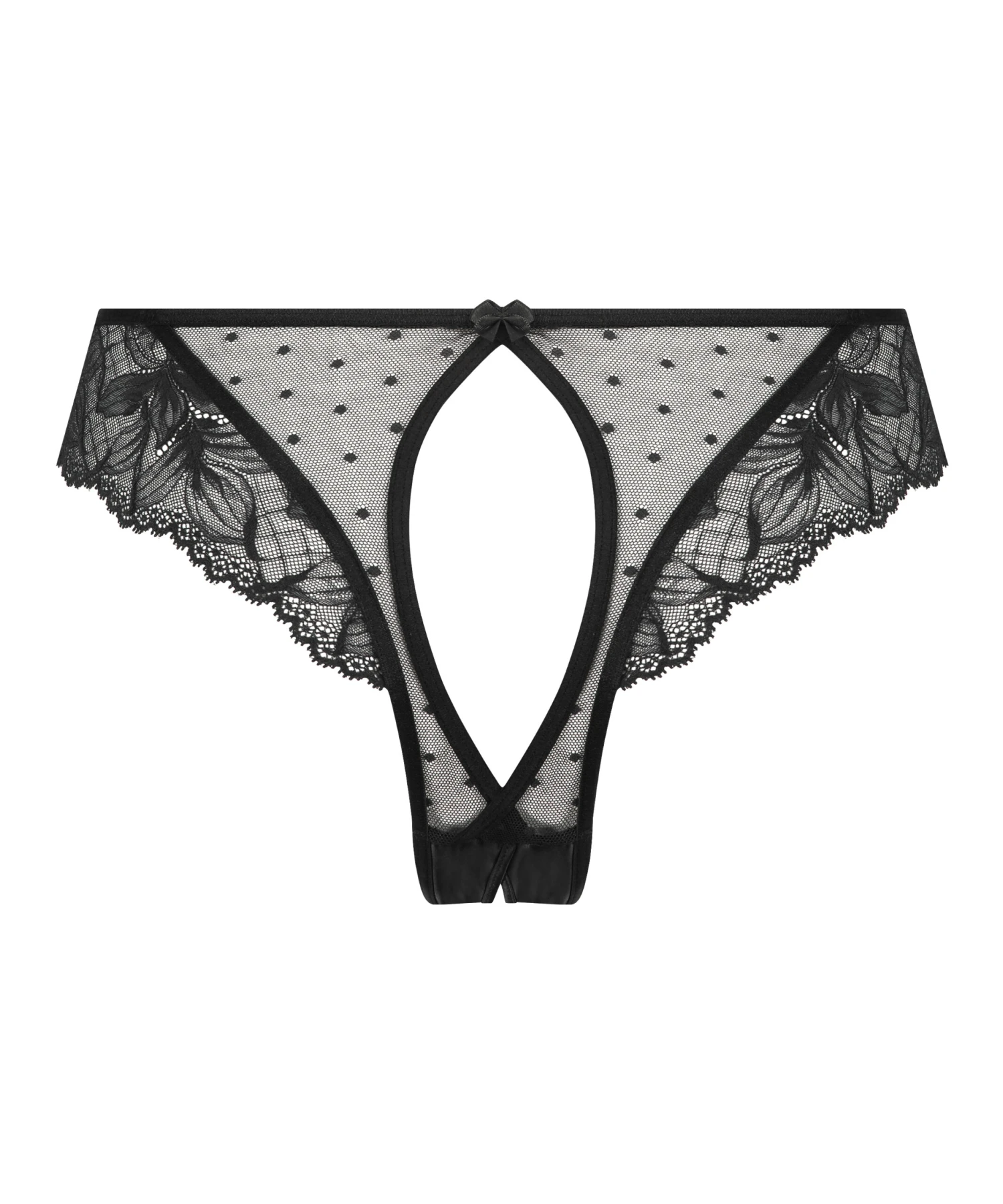 Spice things up with this unique brazilian with open crotch. With an overall mesh look with lace details on the hips. There’s a lovely lace skirt on the hips and the open crotch makes it extra exciting. It also features sexy cut out details and cute bows on the front and back. Complete the set with the matching bra! Part of our Private Collection.