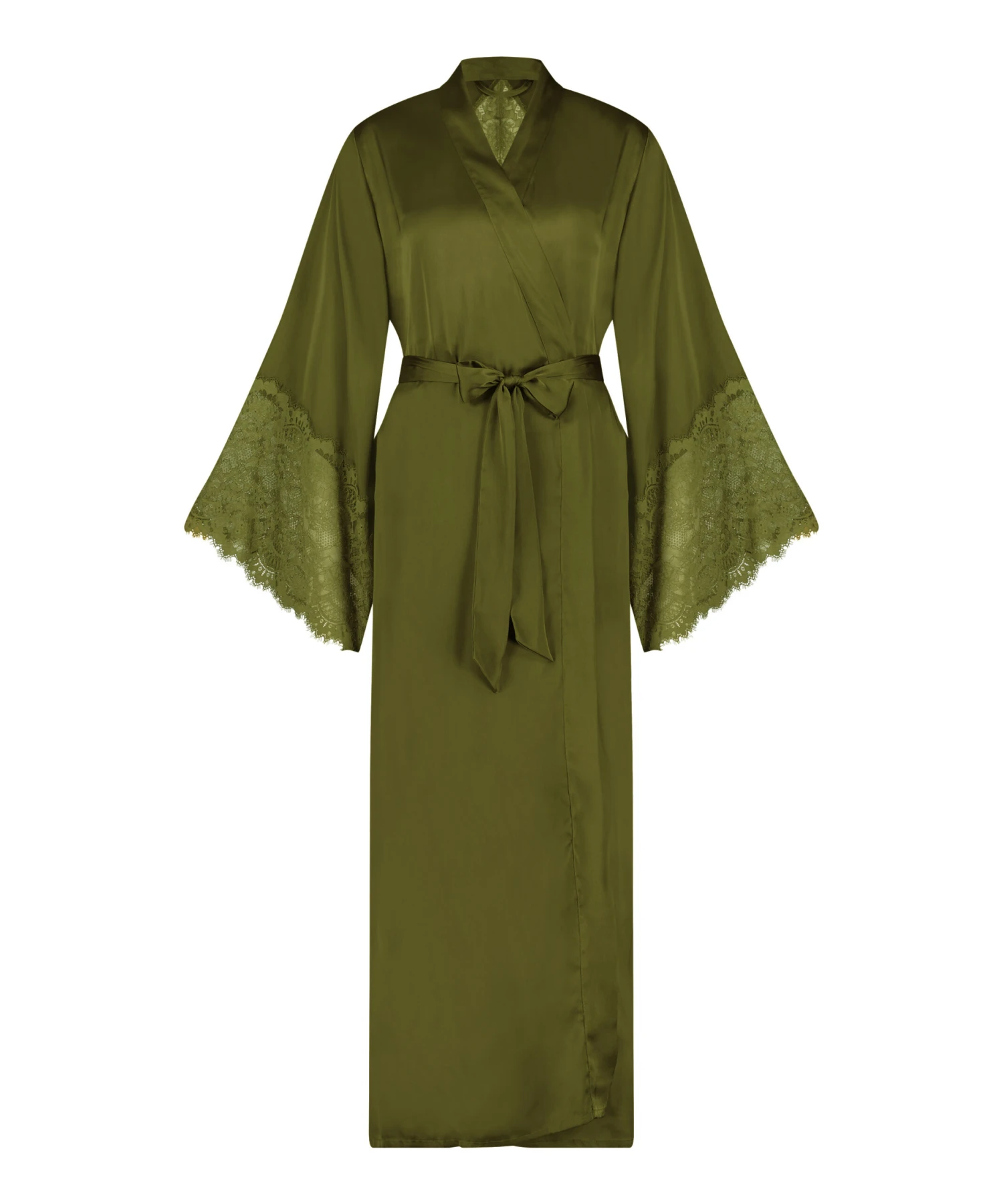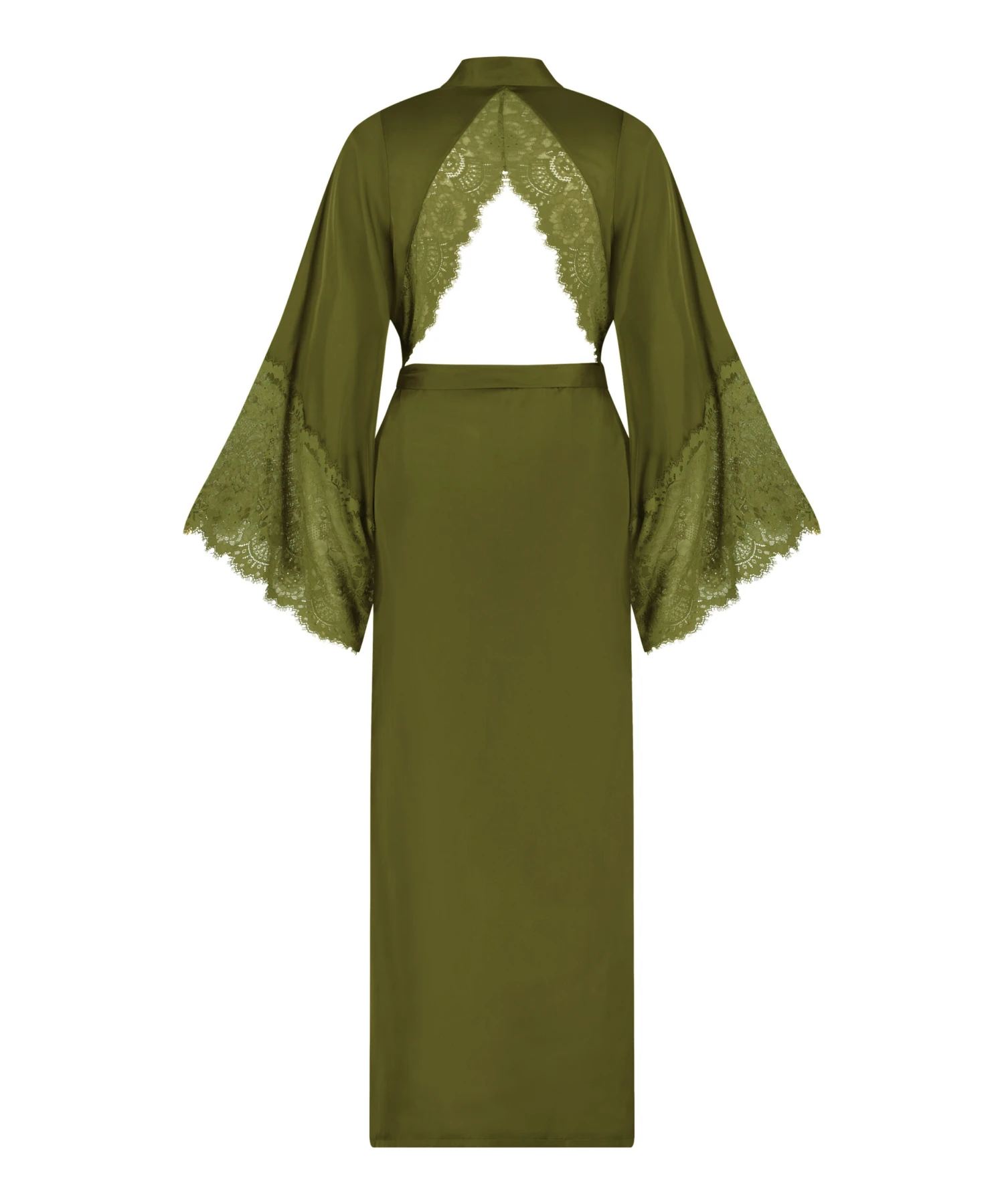 Add a bit of elegance to your lingerie set! Wear this beautiful long kimono to feel stunning. With a stunning open back detail this fabulous kimono with luxe lace details is finished with romantic flared sleeves. Throw this stylish satin kimono over our matching Amelie lingerie set for a luxurious evening look.